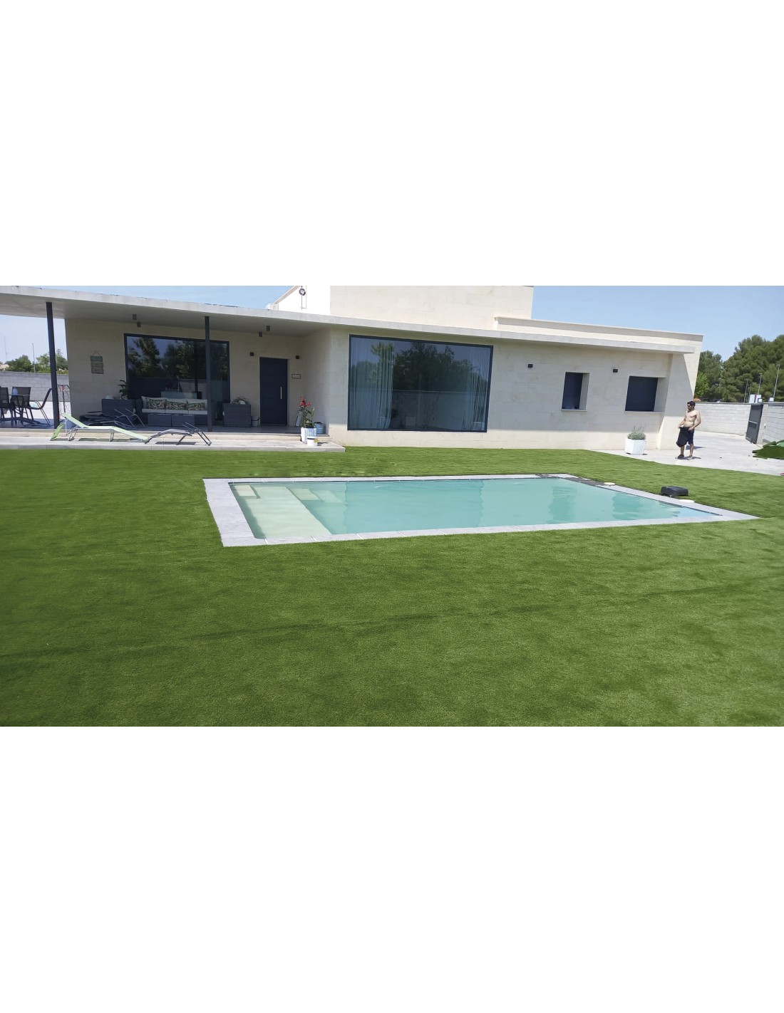 El césped artificial Garona es un césped de máxima calidad, frondoso, muy mullido, suave, agradable al tacto y con un acabado totalmente natural. Está fabricado en monofilamentos en forma de C sobre una base de latex que le aportan un aspecto de césped recién cortado. Las principales características del césped artificial Garona son su notable suavidad y su efecto memoria, como el césped natural. Todo esto se traduce en una mayor sensación de confort y suavidad.