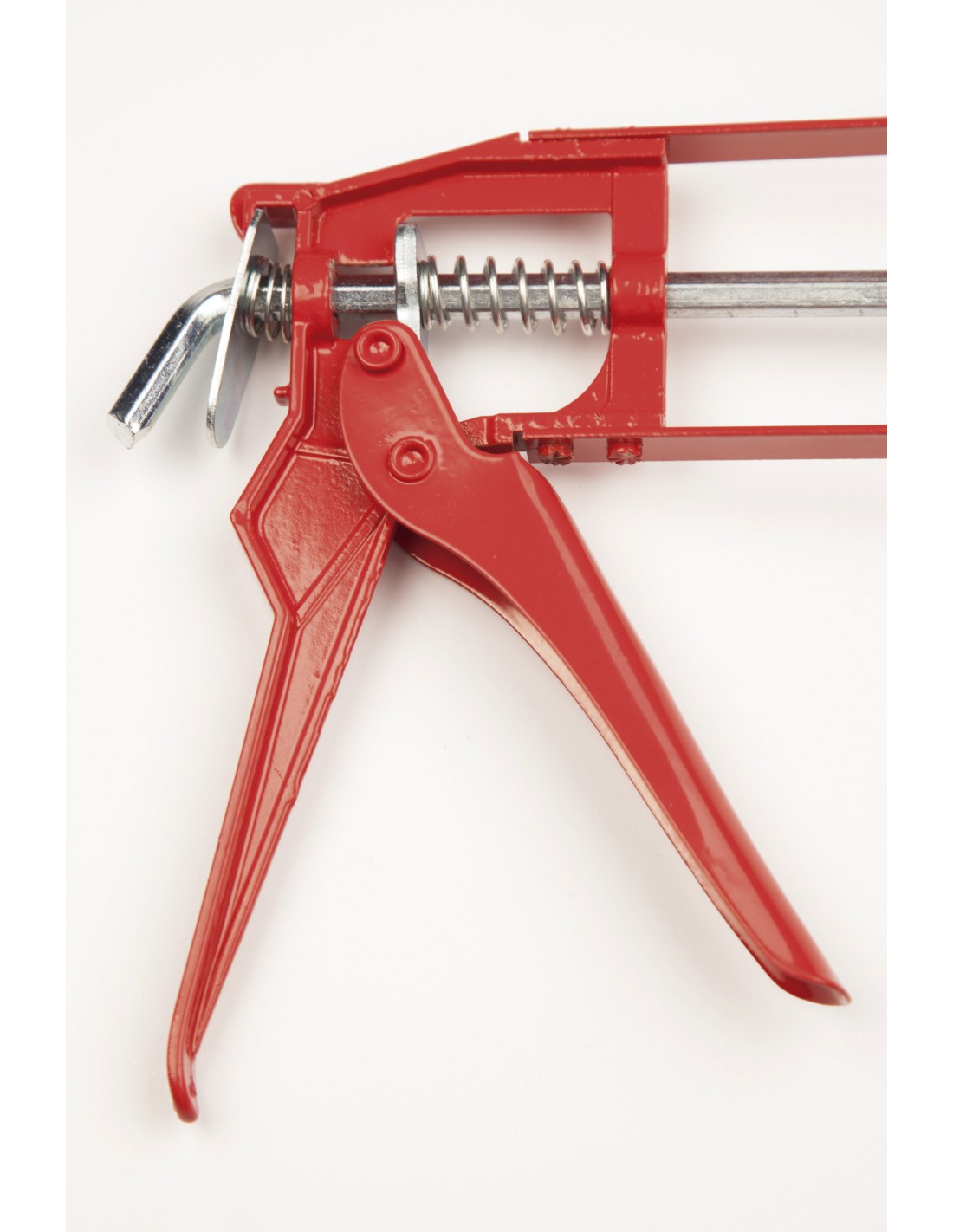 Aplicador de silicona con gatillo de aluminio y barras laterales metálicas.